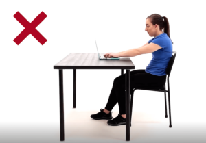 • How are your elbows looking? Aim for another 90° angle! This is ideal whether you’re typing on a keyboard, moving a computer mouse, or writing. If the desk or table you are sitting at is a bit high, add a pillow or a ream of paper under a pillow to raise your seat high enough to allow your fingers to rest on the table top when elbows are bent to 90 degrees while shoulders/arms are relaxed at your side. This will reduce the hiking up of shoulders if straining to reach a high keyboard.